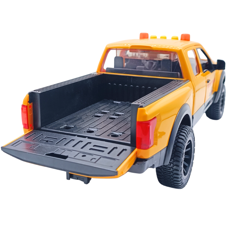 • Sağlam ve havalı tasarım:Gerçek bir off-road aracının hatlarına sadık kalınarak tasarlanmış geniş gövdesiyle bu oyuncak pickup, çocukların en zorlu maceralarında bile dağılmadan dayanacak kaliteli malzemeden üretilmiş.