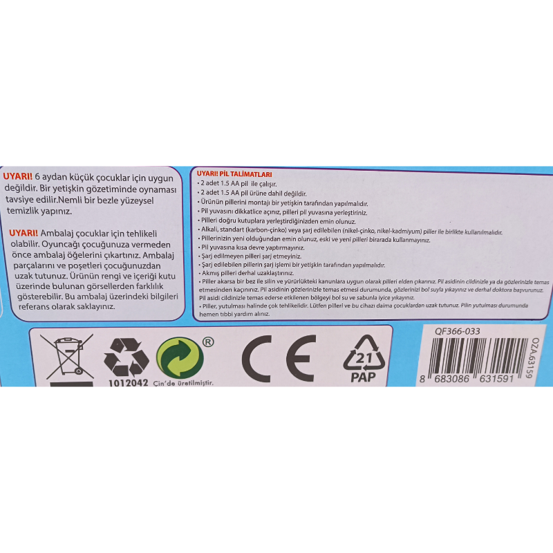 3 yaş ve üzeri çocuklar için uygundur. Boğulmaya neden olabilecek sivri ve küçük parçalar içerebilir. Ebeveyn denetiminde çocuğunuza veriniz. Ürünün ambalajı ürüne dahil değildir. Lütfen ürünü çocuğunuza vermeden önce ambalajını tamamen açınız ve ambalajını çocuğunuza vermeyiniz.