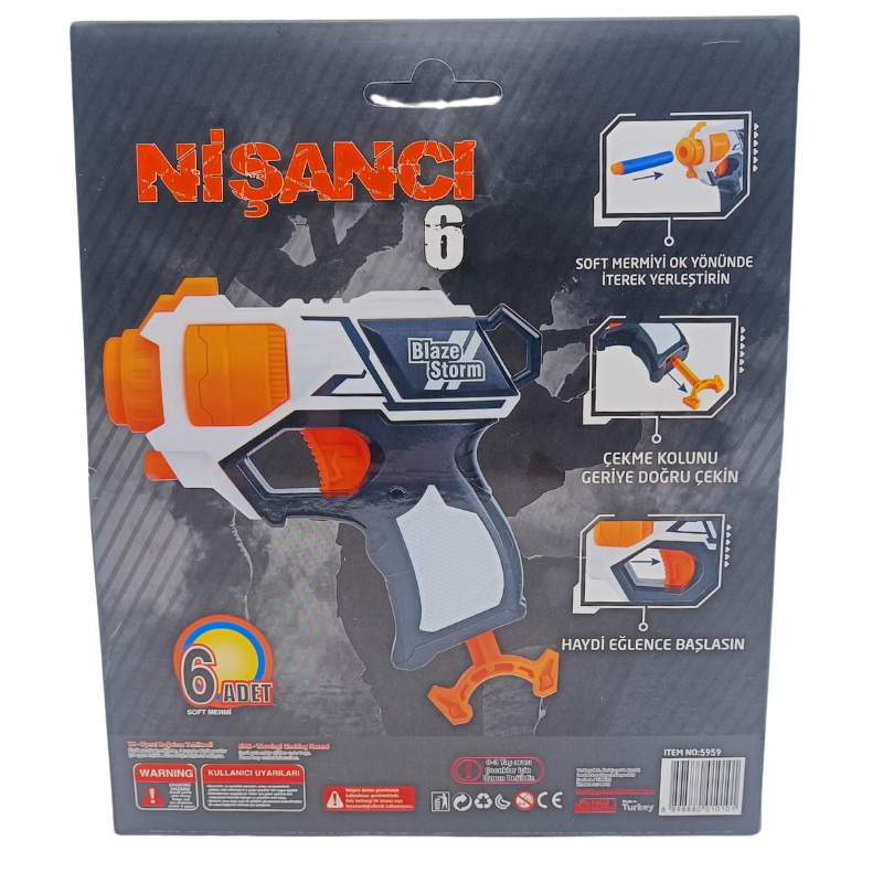 Tabanca, kompakt boyutuyla kolay taşınabilir ve turuncu-siyah renkleriyle dikkat çeker. Her atışta tek dart fırlatılır ve kolayca yeniden doldurulur. Bu sayede, çocuklar arkadaşlarıyla veya tek başlarına güvenli bir şekilde hedef atışı oyunu oynayabilirler.