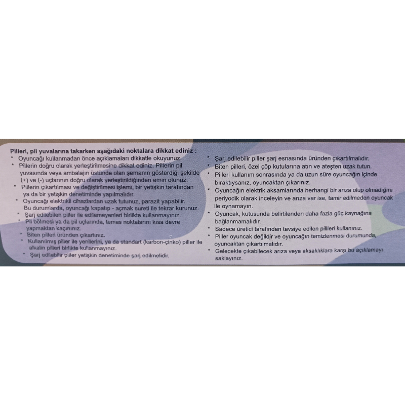 3 yaş ve üzeri çocuklar için uygundur. Boğulmaya neden olabilecek sivri ve küçük parçalar içerebilir. Ebeveyn denetiminde çocuğunuza veriniz. Ürünün ambalajı ürüne dahil değildir. Lütfen ürünü çocuğunuza vermeden önce ambalajını tamamen açınız ve ambalajını çocuğunuza vermeyiniz.