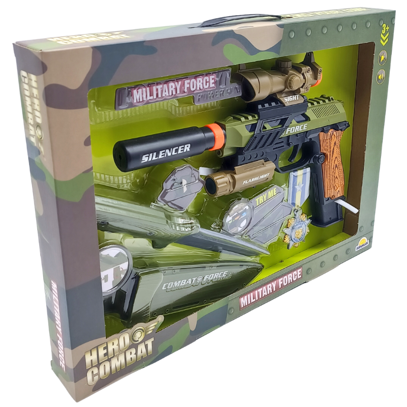 Zengin kutu içeriği: Oyun setinin içerisinde; ışıklı ve sesli ana silah, takılıp çıkarılabilen oyuncak askeri bıçak (sünger/plastik güvenli uçlu) ve çocukların görev sırasında takabilecekleri bir askeri nişan (rozet) bulunmaktadır.